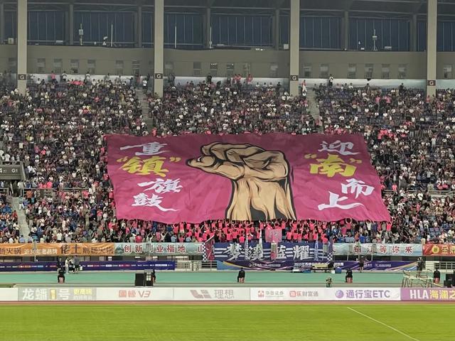 “苏超”第十轮,镇江队在主场迎战南京队。比赛开始前,南京球迷打出“你好镇江”标语。国是直通车 段修健 摄
