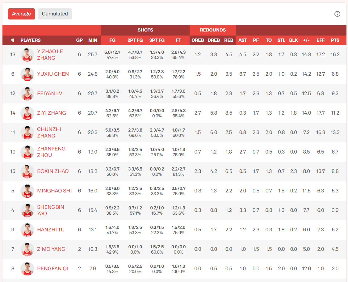 陈昱休场均24.8分钟,拿到6.8分6.7助攻3.5篮板1抢断0.2盖帽,命中率40%,三分命中率50%;(决赛拿9分仅次于张懿赵杰的13分)