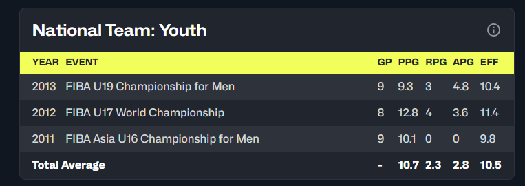 2011年16岁的赵继伟首次打U16亚洲杯,9场比赛场均10.1分(没有篮板、助攻)的记录,反正陈昱休的数据跟赵继伟差距不大,一年后赵继伟U17世青赛场均12.8分4篮板3.6助攻。